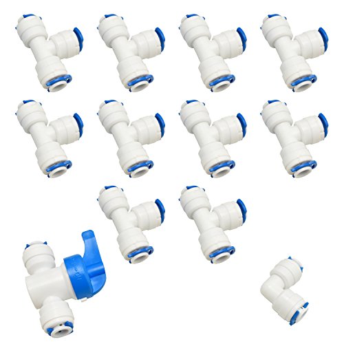 HUAHA 10pcs O.D 1/4" 3 Ways Tee Shaped Tube Quick Push in Connect&Straight Tube Ball Valve Quick Connect Shut Off+Elbow Pipe Connect,Great for Water Machine&Other Clean Drinking Fountain(Set of 12)