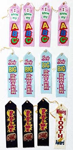 Bundle of 12 Children's Award Ribbons: 4 "I Know My ABC's", 4 "New Big Brother", 3 "Bedtime Champ", 1 "Missing Tooth"