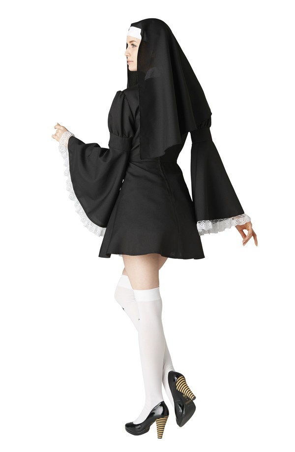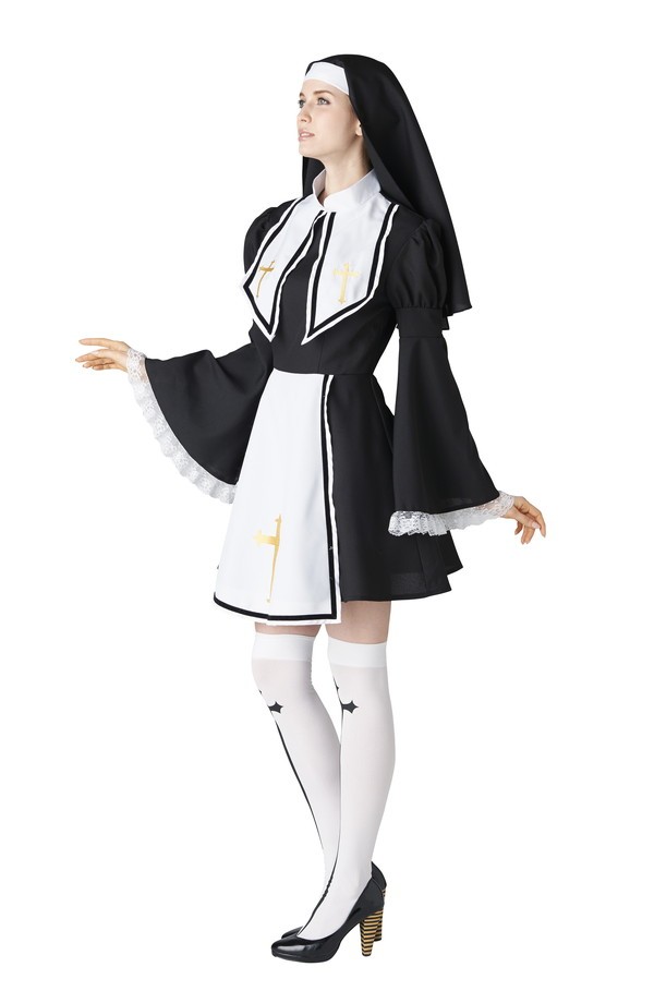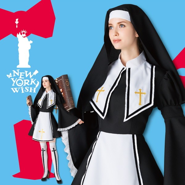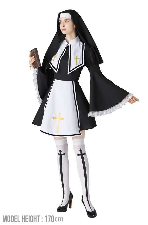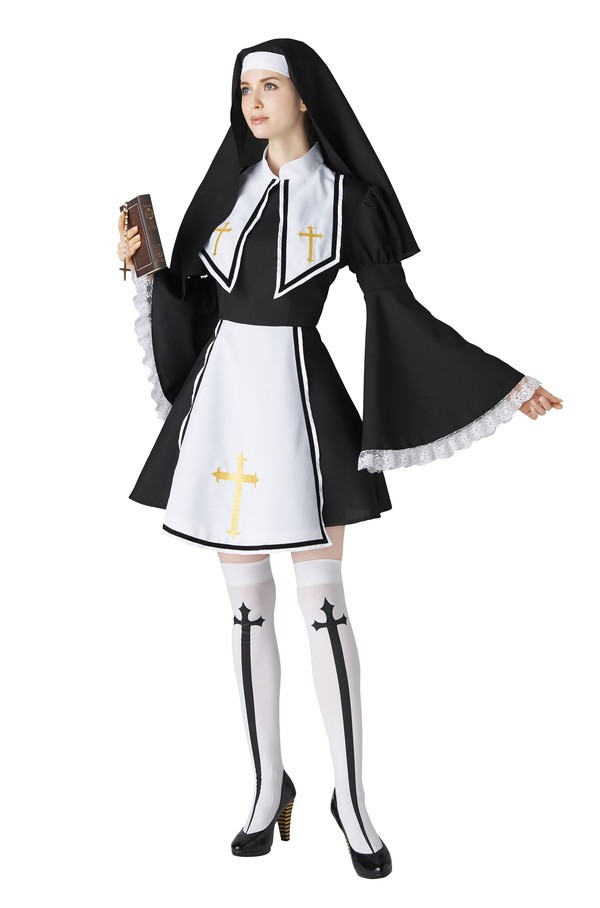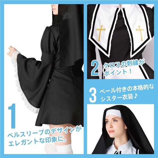 ベルスリーブのデザインがエレガントな印象のシスターコスチューム♪大きな襟とクロスの刺繍がポイント!オンリーワンなコスチュームを着たい方におすすめ☆