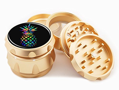 Rainbow Pineapple Gold Herb Grinder 2.25" Wide 4 Piece Premium Quality Grinders Aerospace Grade Aluminum Metal Diamond Case - Black Felt Bag and Gift Box!