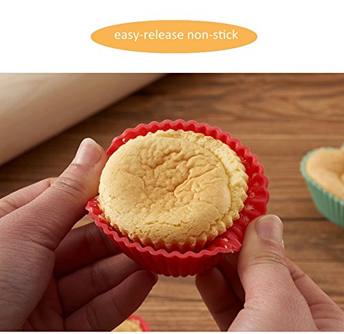 - ♦EASY CLEAN & STORAGE - This round non-stick bakeware is easy and safe to clean up in dishwasher, but for hand washing, please soak cupcakes liners for a while in the water. Furthermore, heap the small light soft silicone muffin molds together, imagine this space saver cupcake holders in your kitchen baking supplies pantry!