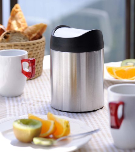 - Feature : small and portable: Convenient size fits right on the table or countertop. / balanced swing lid: Center-weighted swing lid opens easily and then gently swings back into place. / fingerprint-proof: Fingerprint-proof finish resists smudges to keep stainless steel shiny. / lift-off lid: Lid comes off easily to empty contents. / easy-to-clean interior surface: Smooth plastic inner lining is easy to wipe clean.