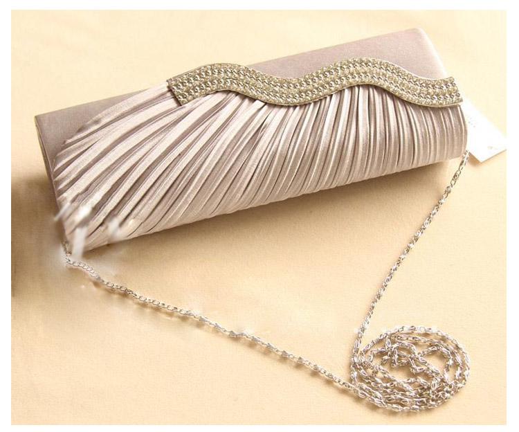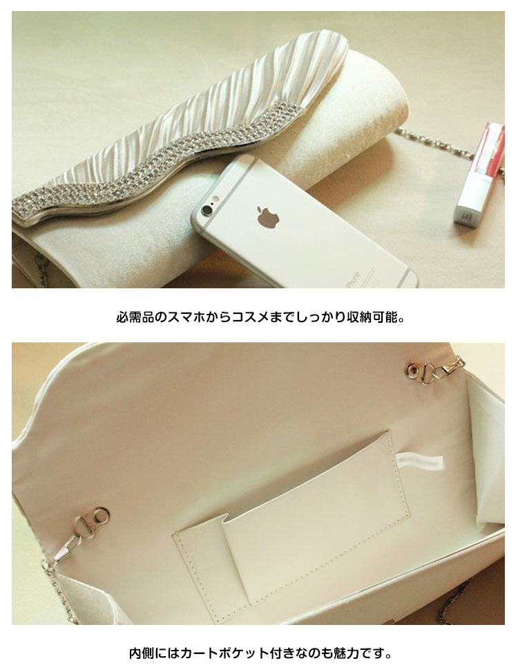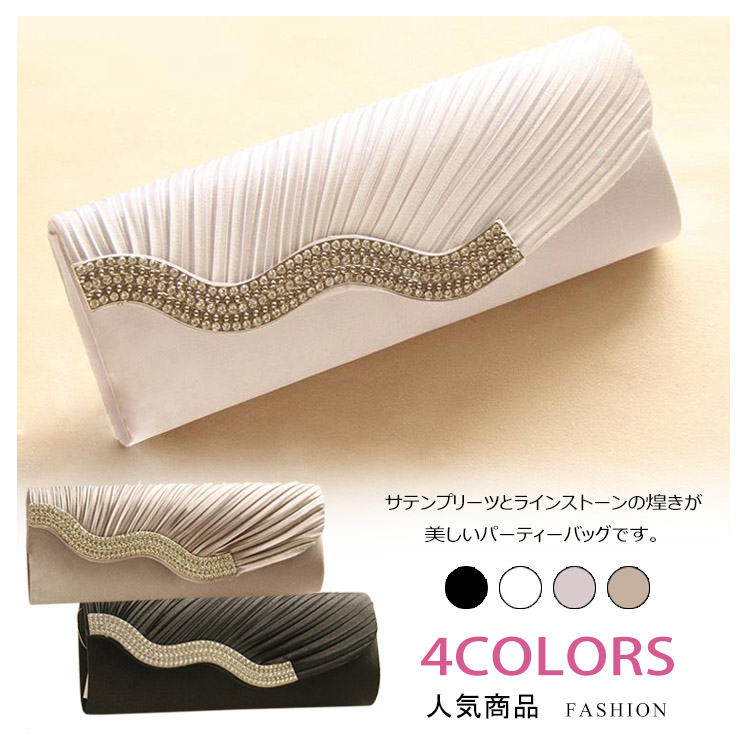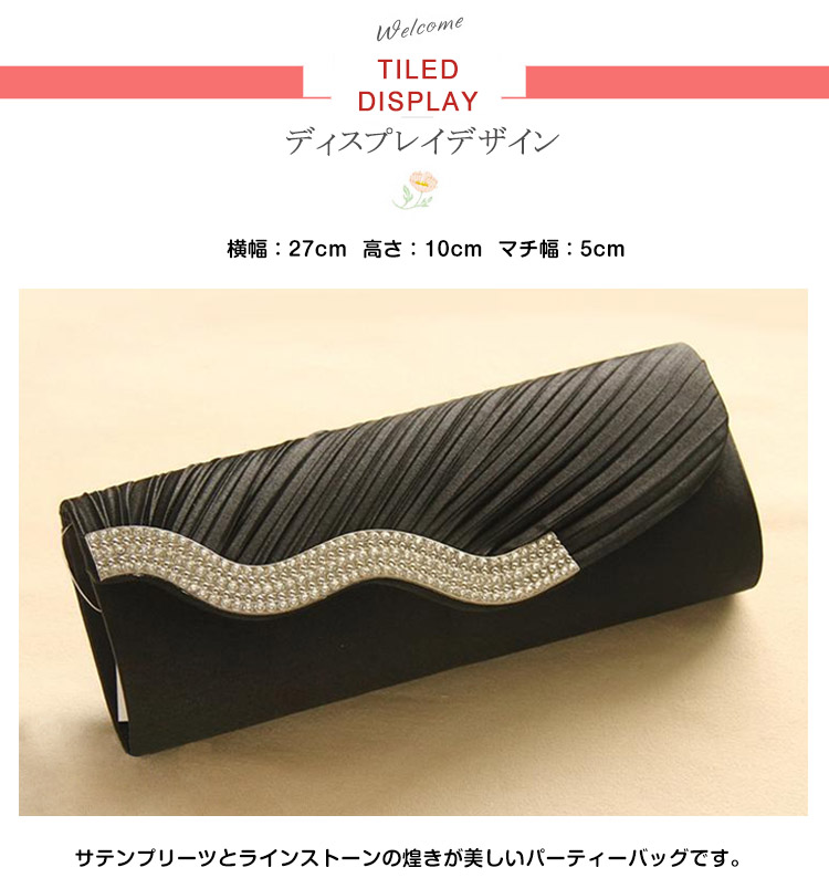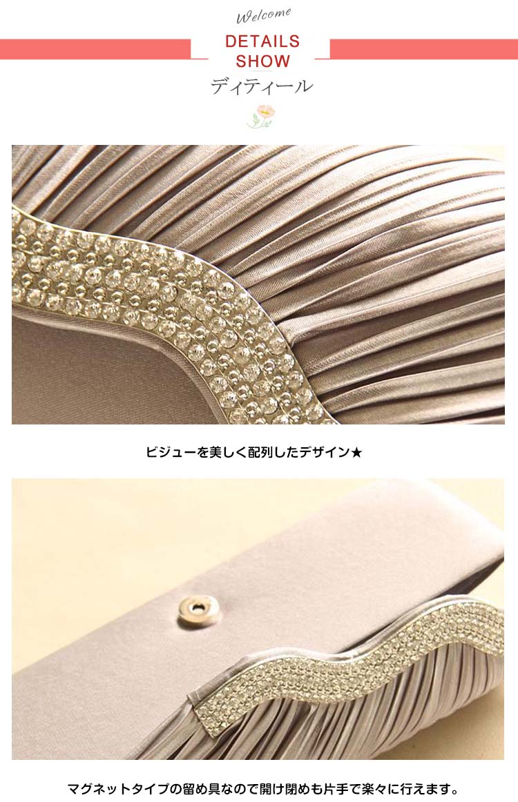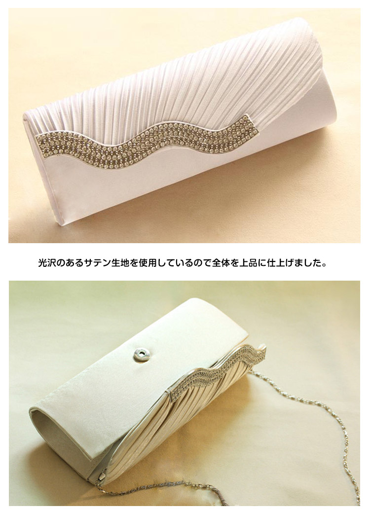 | サテンプリーツとラインストーンの煌きが美しいパーティーバッグです。光沢のあるサテン生地を使用しているので全体を上品に仕上げました。化粧品やスマートフォンなどの必需品も入り使いやすいサイズ感♪結婚式や披露宴、2次会にはもちろんお食事会や謝恩会など活躍の場がたくさん◎お好みのカラーをお選びください♪ | |