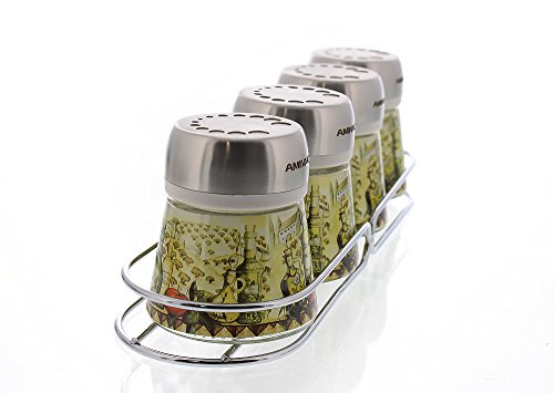 Includes 4 glass shakers with stainless steel screw-on caps.