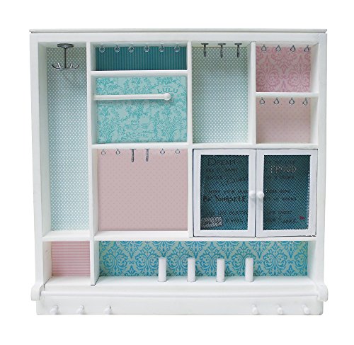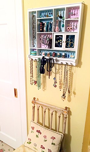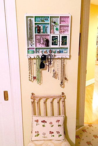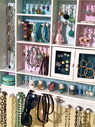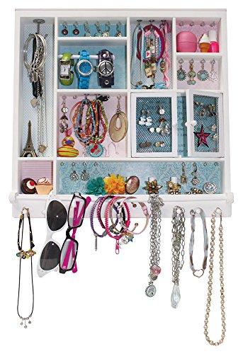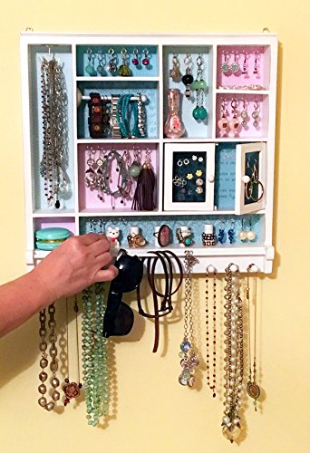 The ultimate way to store and display all your stuff! Hooks to hang Necklaces, Bracelets, Dangling Earrings and More. Mesh Doors to hold lots of stud earrings; posts to stack up your rings; compartment to stash precious pieces and bar to hang hair accessories and so much more.Feature