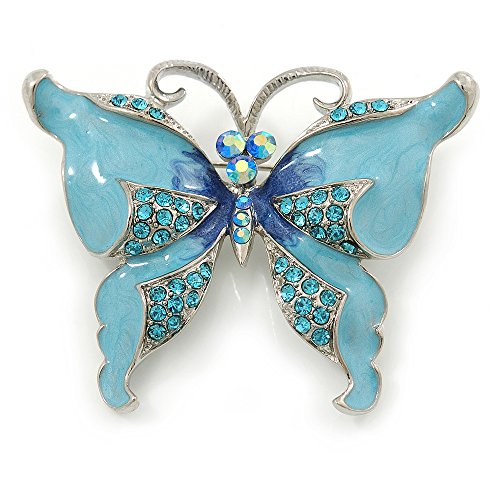 -. Title : Sky Blue Enamel Crystal Butterfly Brooch In Rhodium Plating - 50mm W