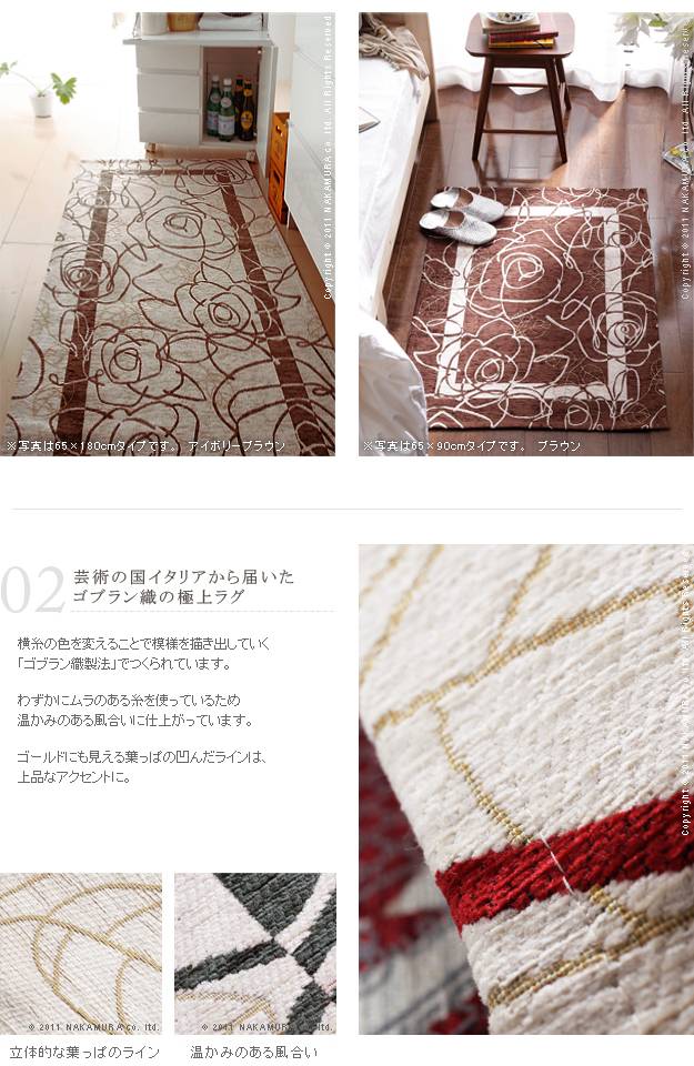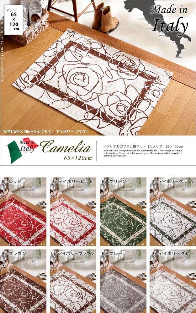 ●商品について:カメリアが描かれたゴブラン織の上品なやわらかいマット。織物らしいフラットな質感と短い毛足で一年中さらさら。全面滑り止め加工でお子様からお年寄りまで足元安心♪洗濯可。床暖房・ホットカーペット対応。
