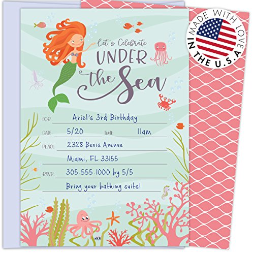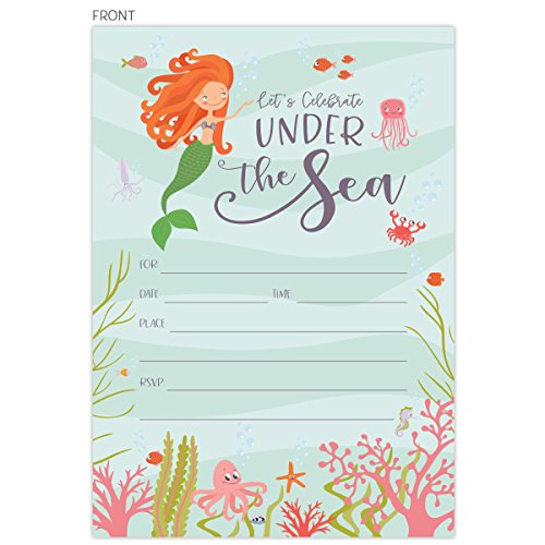 Under the Sea Mermaid Invitations with Deep Sea Creatures, Seaweed and Coral. 25 Lavender Envelopes and Fill in the Blank Style Invites for Birthdays,...