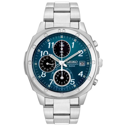 세이코의「크로노그래프」 실버의 라운드형 케이스.블루의 문자판에,인덱스는 아라비아 숫자를 채용.기능으로서는,크로노그래프,12시 위치에 1/20 초계,3시 위치에 날짜 표시 기능,6시 위치에 60 분계와 12시간계,9시 위치에는 스몰 세컨드를 탑재 하고 있습니다.
