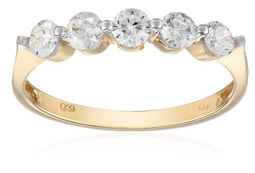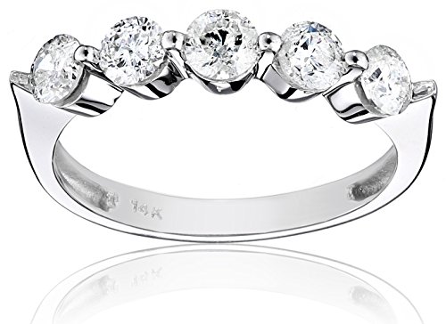 This elegant five-stone diamond ring is available in your choice of 14 karat white or yellow gold. Five round diamonds (3/4 cttw) span the top of the ring, held in shared prong settings that accentuate the individual stones. The polished gold band tapers at the shoulders to further highlight the diamonds. This is a beautiful ring, and it makes a lovely gift for any occasion.Feature