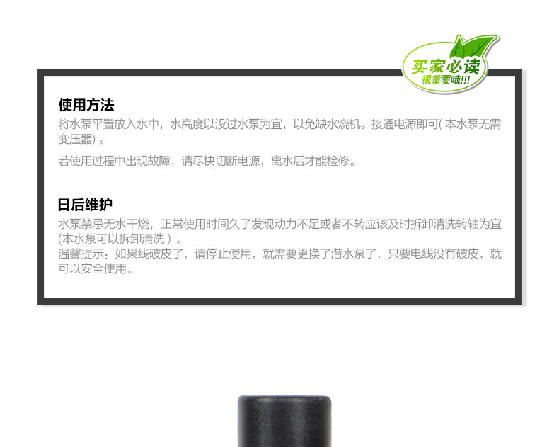 Q仔宠物Voltage: 220VPower: 8WHead: 1.2Flow: 600L / HSize: 65 * 45 * 56mmWater caliber: 12mm, 8MM2 kinds of pump headExternal water pipe: diameter of about 12MM, 8MMCable length: about 1.5 meters