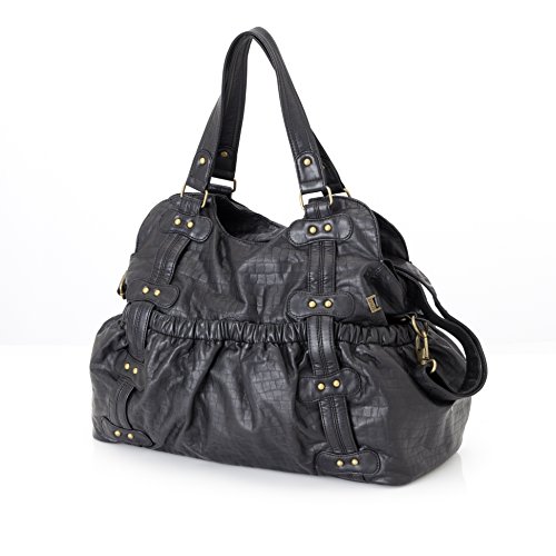 This faux crocodile studded tote is perfect for all your baby or toddler needs! the main compartment is large and deep, and it's filled with roomy pockets to keep all the essentials organized. Double handle straps make it easy to grab and go. Water resistant coordinating lining and accessories; also features detachable, adjustable shoulder strap and detachable stroller straps.