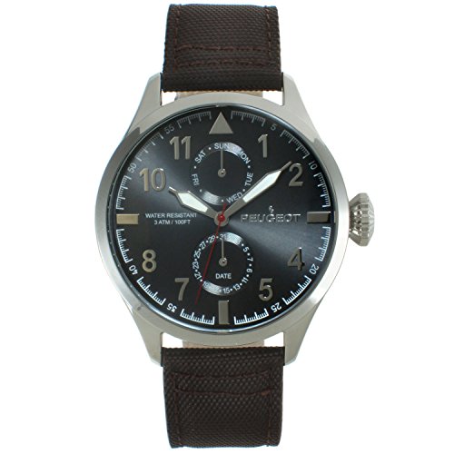 -. Title : Peugeot Mens Silver Brown Canvas Band Day Date Calendar Aviator Watch