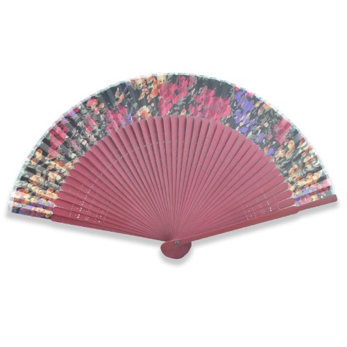 Bamboo Folding Fan - Colorful Floral Design in Black - Red