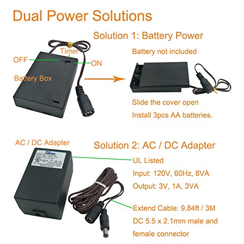- Timer Function for Battery Power Solution- 6 hours working time when timer switch on, restart automatically after 24 hours of last time operation for the timer switch,and this is only for Battery Power Solution,not for Electric / Corded Solution (AC/DC Adapter)