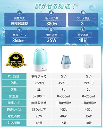 市販の加湿器は、加湿量が230mL/hしかない、なかなか加湿が不足です。本製品は加湿量が300~380mL/hなので、広いお部屋を隅まで潤すハイパワー!夜に給水しても朝までしっかり加湿できます!