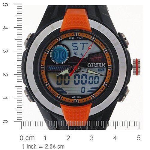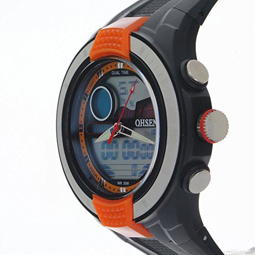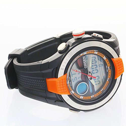 Specification: Goods Nameplate: OHSEN Case: Plastic Movement: Electronic& Quartz Bracelet / Strap: Rubber Diameter of case: 47(mm) Diameter of dial: 32(mm) Width of band: 20(mm) Thickness of case: 16(mm) Color: Orange Movement model: Weight: 0.04(Kg) FUNCTION 1. Fashion and sport style with fashionable bezel. 2. Electro-luminescent Backlight in darkness LCD display hour minute second month week and AM/PM. 3. 12/24 hours dual time display mode. 4. Stopwatch function. 5. Functional alarm setup and hourly reminder. 6. Water resistant. 7. Quality plastic watch strap. 8. Kinds of colors to choice S1=LIGHT S2=MODE S3=UP S4=SET How to convert mode 1.At the normal time display press S2 to enter into the world time mode. 2.At the normal time display press S2 twice to enter into count down mode. 3.At the normal time display press S2 three times to enter into timing mode. 4.At the normal time display press S2 four times to enter into alarm mode. How to use the countdown 1.At the countdown mode press S3 once to start then press S3 again to suspend. 2.At the countdown mode holding on S4 to enter into adjusting. 3.Press S3 to adjust minute. 4.Press S2 to return the primary setting time. 5.Press S3 again to set to turn on / off the warning tone by automatically circle. How to use the stopwatch 1.At timing mode press S3 to start timing press S3 again to suspend. 2.Press S4 to count many times. 3.Press S3 to suspend counting then press S4 to display the total. Press S4 again to z