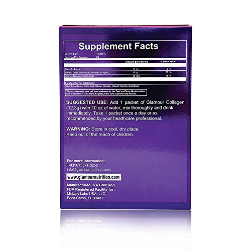 ReleaseDate : 2017-08-14 Studio : Midway Labs USA Publisher : Midway Labs USA Binding : Health and Beauty Product Description As we age, collagen production declines and consequently your skin's appearance and elasticity is effected. Increasing collagen levels can help your skin look firmer, increase smoothness and help your skin cells keep renewing and repairing normally. Scientifically designed to promote beauty from the inside out,?Glamour Collagen?is composed of premium ingredients such as High Quality Hydrolyzed Peptinex B Collagen which has been broken down into smaller molecules, called peptides for better absorption. Studies have shown that collagen peptides are well absorbed in the digestive system and make their way to targeted tissues, where they act as building blocks for the elasticity and health of your skin. In addition?Glamour Collagen?also contains Vitamin C (Ascorbic acid). The antioxidant properties of Vitamin C and it's role in collagen synthesis makes Vitamin C a vital molecule for skin's health. 0