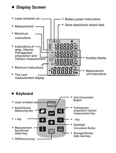 - ▶ MULTI FUNCTION: Support continuous measurement, addition/subtraction function and Max/Min measurement, switchable units (meter, inch and feet) &backlight LCD with multi-line display, Supports data hold and data clear function, Supports data store/recall function of up to 99 measure