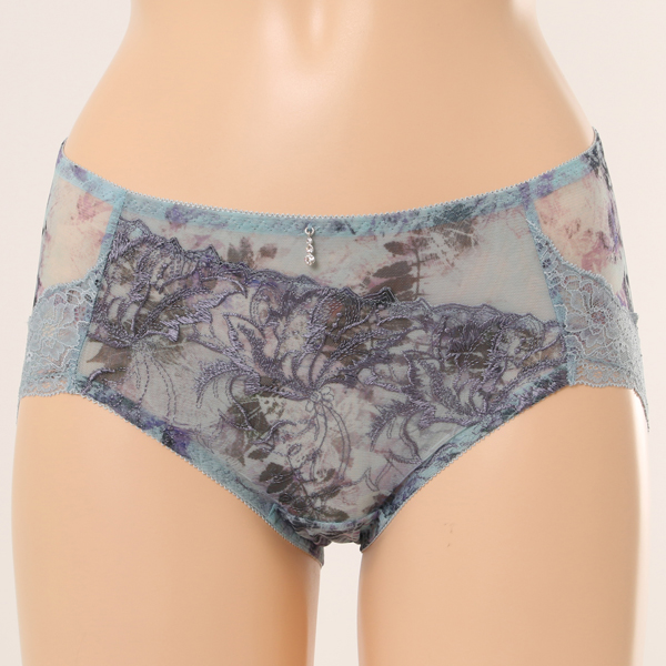 프린트 위에 큰사이즈의 꽃과 나뭇잎 자수가 놓인 우아한 부인군 제품입니다.