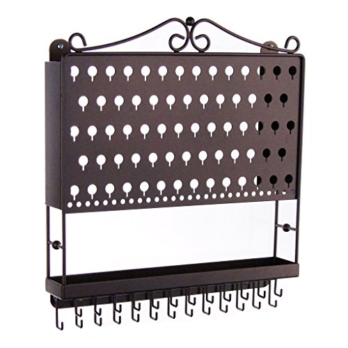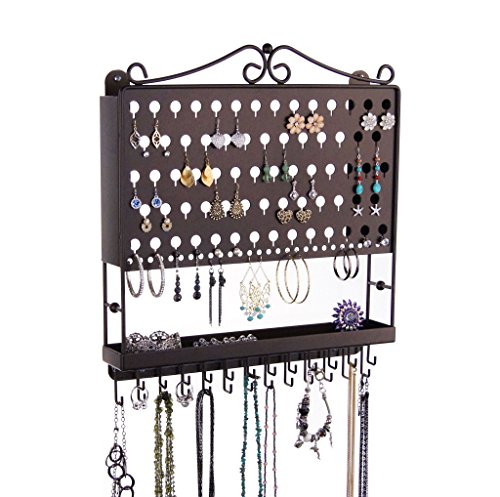 - Wall mounted jewelry organizer, earring holder, bracelet and necklace rack storage capacity: Displays 48 pairs of earrings and 25 to 75+ necklaces or bracelets (1 to 3 per hook). If all of your earrings are 2 inches long x 1/2 inch wide 48 pair will fit. Created for small to medium sized earrings, however long earrings can hang on the bottom row. If all of your earrings are 2" long x 1/2" wide 48 pair will fit.