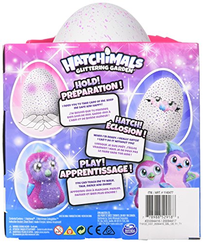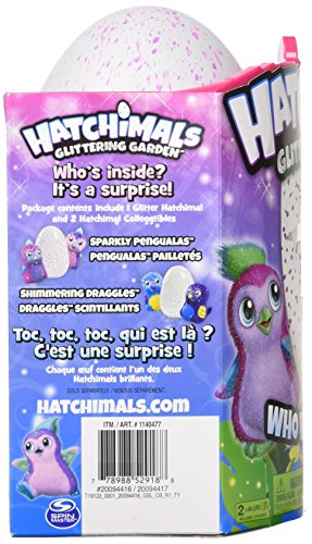 Hatchimals Glittering Gardens have some new magical creatures ready to hatch and find a forever home. Who's inside each egg? Well that's a surprise that your child can reveal. Each glittery egg contains one of two interactive Hatchimals with colorful shimmering fur. Hatchimals can't hatch on their own and need a nurturing and loving touch to encourage them to peck their way out. Its eyes light up and make cute sounds to tell you how it feels. After playing with it for an adequate amount of time, you will see rainbow eyes which means it is time to hatch! You get to raise your Hatchimal through 3 stages: baby, toddler, and kid. It even sings "Hatchy Birthday" every time it goes into a new stage. You can teach it how to walk, play games and dance. It even repeats what you say! For ages 5+ and requires 2 AA batteries (included). Additionally this box includes two bonus Hatchimals CollEGGtibles! These adorable CollEGGtibles needs your help to hatch. Hold the egg in your hands, rub the heart and when it changes from purple to pink, it's ready to hatch! Press on the egg to crack it and discover which Hatchimal CollEGGtible is inside. (Figures will vary) Hatching can only happen once, so make sure to share the experience!Feature
