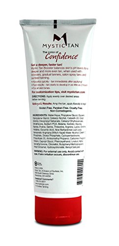 Get a deeper, faster tan. Mystic tan booster balances the skin's ph. levels for a deeper and more even tan, when used with bronzers, gradual tanners, salon spray tans and sunbed tanning. Helps hydrate and moisturize the skin, contains antioxidants to help reduce free-radical damage and environmental stress on the skin.