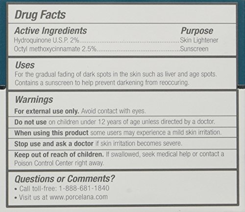 -. Binding : Health and Beauty -. Brand : Porcelana -. EAN : 0855093002499 -. Feature : For balanced skin tone. Fades dark spots. / Evens skin tone / Protects with anti-oxidants & sunscreen. / size: 3oz -. Label : porcelana -. LegalDisclaimer : Please understand that the cream/container moves/shakes during the shipping process causing the contents to move and sometimes the contents stick to the top of the lid, this is a normal process. These products are NEW and have not been used in any way. Thanks -. Manufacturer : porcelana -. MPN : B00CG9S6F4.resticker -. PackageQuantity : 7 -. PartNumber : B00CG9S6F4.resticker -. ProductGroup : Beauty -. ProductTypeName : HEALTH_PERSONAL_CARE -. Publisher : porcelana -. Studio : porcelana -. Title : Porcelana Day Skin Lightening Cream 3 Oz -. UPC : 855093002499