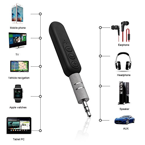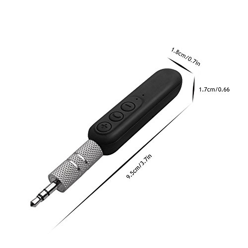 Studio : YueMu Publisher : YueMu Binding : Electronics Product Description ? With super audio quality and fine design, this BT4 Bluetooth Audio Receiver can change your car/home speaker to Bluetooth ones, so you can enjoy pure, clear ,wireless music and answer the call in hand-free mode, ensuring your driving safety while enjoying music. Equipped with an 3.5mm Jack to Jack Connector ,it can be plugged into a speaker, an earphone, headset, or any other audio device, making it easy and convenient to use. What is more, this Bluetooth Audio Receiver can pair with 2 Bluetooth devices at a time ,which makes it more flattering. ? Features: ? 1.Portable design, easy to carry ? 2.Super audio quality, providing pure sound output ? 3.Short /long press a button to answer/cancel a phone call, easy to use ? 4.Automatic memory connected function, double click to dial the last phone call ? 5.Support two Bluetooth devices connecting at a time, switching alternately ? 6.Compatible with all home stereos / speaker, car stereos, headphones which support 3.5mm audio input ? 7.Support iPhone, Android phone, any other smart phones which with Bluetooth function ? ?Specification: ? ? Type:Bluetooth Audio Receiver ? ? Model:BT4 ?? Material:Plastic ?? Quantity:1set ?? Color :Black ?? Bluetooth Version:V4.1 ?? Supported by Bluetooth protocol:A2DP and AVRCP,AVDTP, HFP, HSP ?? Valid?Distance:Barrier-free 10-meter effective distance ? ? ? ? ? Frequency Range:2.4GHz ? ? Battery:Built-in Li-ion battery ? ? Working Hours:4 Hours ?? Charging Time:30min ?? Output:3.5mm audio jack ?? Item Size:9.8*1.5*1.7cm / 3.9*0.6*0.7" ? ? Net Weight:0.015kg / 0.53oz ? ? Package: ? 1 * Bluetooth receiver ? 1 * 3.5MM jack to jack connector ? 1 * User manual 0