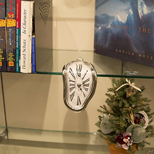 The clock's angled design adds to the melting effect. Instead of hanging it on the wall, place it on a shelf so that it seems to be slipping off the edge. It fits just right in bookcases, on kitchen counters, in the pantry, and on windowsills. You can even use it as a book stop, thanks to its rigid plastic construction. Two supporting pegs can be found on the back of the unit, which rest the clock against walls or cabinets and keep it sitting pretty.