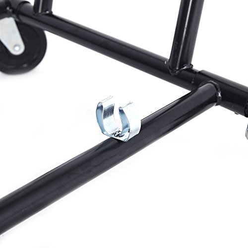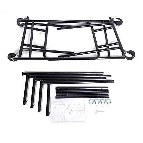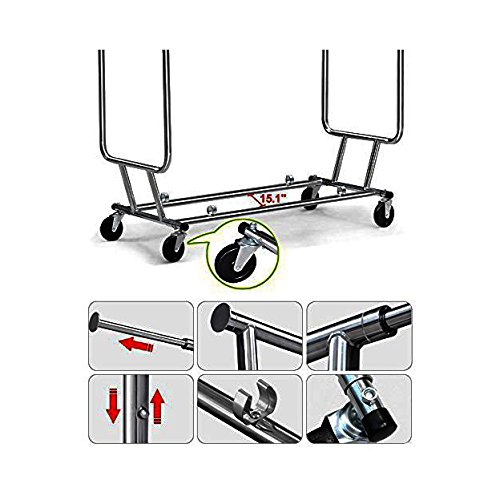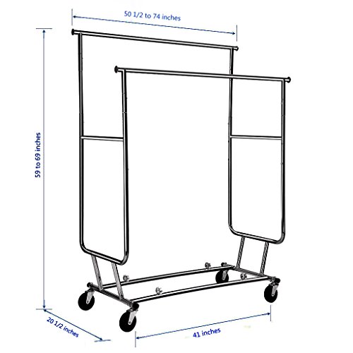 -. Feature : ADJUSTABLE HEIGHT AND LENGTH: The 2 upper hanging rails have 2 pull-out rods at both ends and can extend from 50 1/2 inches to 74 inches to hang more clothes. The 4 vertical support posts can rise from 59 inches to 69 inches to accommodate long dresses or coats / FULLY COLLAPSIBLE GARMENT RACK: Our unit collapses into a flat shape for space saving storage and easy transport. The 2 upper hanging rails can be taken apart and fixed into clamps on the lower bars for storage & transport / SWIVEL CASTERS: Four swivel casters is designated for easy moving and just a push and a pull, you can take it to your desired place. Stability can also be guaranteed for these 4 casters keeping it steady and balanced / MULTIPURPOSE STORAGE & EASY ASSEMBLY: The 2 sturdy side rails can hang scarves, umbrellas, hangers or other items. Baskets, boxes, and other flat items can be placed along the bottom bars for extra storage / STURDY CONSTRUCTION: Heavy duty stainless steel frame, rust-proof, for both household and commercial use. It matches with any domestic decor styles, ideal for balconies, bathrooms and laundry rooms