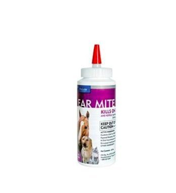 -. Feature : Description Ear Mite Killer w/ Aloe Economical ear mite solution (Trade Winds) Ear Mite Killer with Aloe kills and repels ear mites, flies, gnats, mosquitoes, fleas, ticks, lice and mange mites. Use Ear Mite Killer Lotion on dogs, cats, horses, foals and puppies or kittens over 12 weeks old. Ear mites feed on tissue debris and secretion from the ear canal lining. With repeated irritation, the ear canal thickens and debris builds up within the ear canal. This debris, caused by mite waste, dead tissue and fluid, resembles coffee grounds.