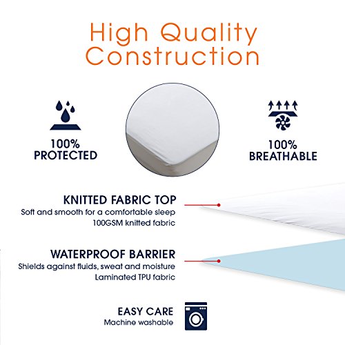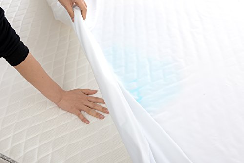 -. Feature : 100% WATERPROOF PROTECTION - Preserve your mattress and keep it fresh and clean from spills and accidents. Fully absorbs urine, fluids, and sweat / STRETCHY, BREATHABLE FABRIC -Protect your mattress without giving up any of its comfort. Allows you to sink into your mattress for a deeper sleep / ULTRA SOFT AND NOISELESS - Designed to provide an extremely comfortable and blissfully quiet sleep while protecting from bedwetting / HYPOALLERGENIC BARRIER - Protects from dust mites, bacteria, allergens and bacteria. Great for kids, pets and those with incontinence / FITTED DEEP POCKET SKIRT- Elastic stretch fabric around the edges easily fits deep mattresses. Twin, Twin XL, and Full stretch up to 14"| Queen and King up to 18"