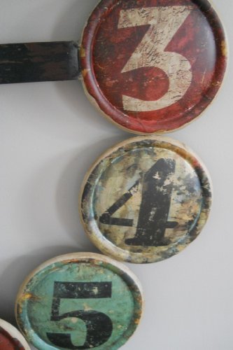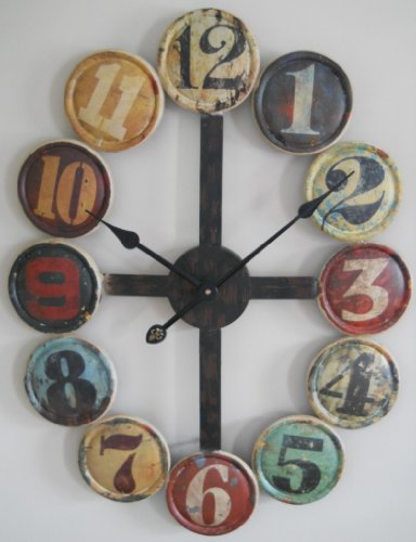 - Feature : Measures approximately 27"H x 21"L / Unique multi-colored clock comprised of large round numbers / The numbers are finished in various distressed colors / The positioning of the round numbered pieces can vary with each clock / Operates on one "AA" battery (not included)