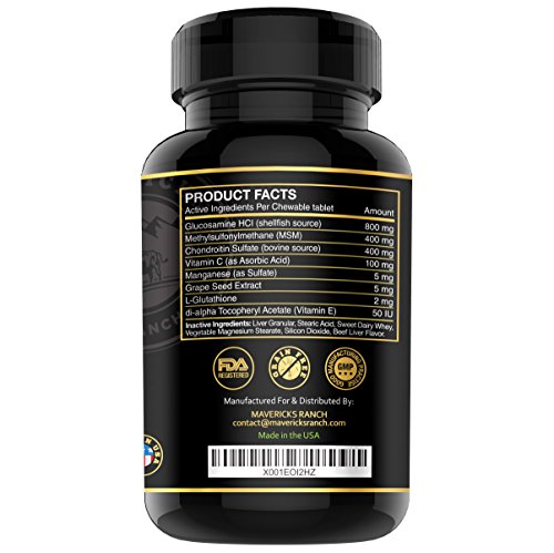Product description If your furry friend was heading towards agonizing daily pain, would you ever know it? Besides the occasional whimper or burdened, sorrowful look in their eyes, when would you really be able to tell? Chances are, you wouldn't. Before it's too late. But sadly, this is what millions of dogs in the U.S. go through every day. Joint pain, stiffness and arthritis is extremely common, among dogs of any age, and only worsens in later years. As your dog goes through it's everyday life, their joint cartilage slowly wears down. Until hip and joint bones are rubbing painfully upon each other with every step By now, those walks they used to love now only lead to excruciating pain. It's at this point where dog supplements becomes vital, it's only a choice of treatment or prevention. But if that's true, would you knowingly under-dose your dog? We'd sure hope not. But that's exactly what happens when you buy "cheap" hip and joint supplements that provide tiny vitamin doses and low quality ingredients. Mavericks Ranch is different. We provide the Strongest & Most Effective dosage of key active ingredients in our dog glucosamine treats Keeping your dog as active, happy and healthy for as long possible Don't let their symptoms worsen until it results in unbearable, arthritic pain when walking, fetching, or playing. Take action now.Feature