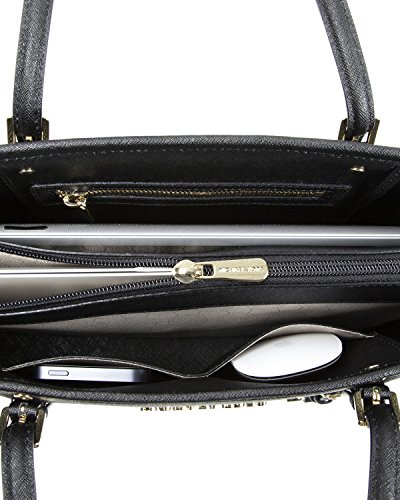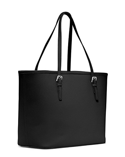 Michael Kors® Jet Set Travel Small Tote. MICHAEL Michael Kors 11" Small Jet Set Travel Tote for MacBook Air and iPad Luggage saffiano leather. Buckled shoulder straps. Golden hardware. Logo medallion hangs on front. Compatible with 11" Macbook Air. Inside, pockets for and iPad; one zip and one open pocket. 9 H x 14 "W x 5 "D; weighs 1.75 lbs.; 7" dropFeature