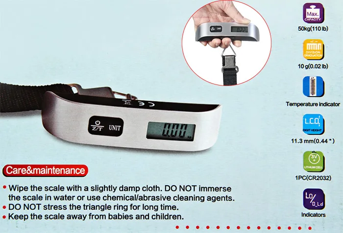 As a smart traveler, packing your suitcase to stay within the weight limit is always bothering yourself. Low-cost airlines will be really nasty about excess baggage. So, you need to check the weight of your baggage ahead. This Hand Carry Electronic Scale is an easy solution to this problem. Compact size and LCD make it very convenient to use, perfect for home use, travel, business trip etc. Good choice to own it. Never pay unexpected excess airline baggage fees again!