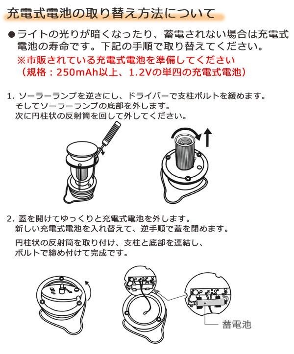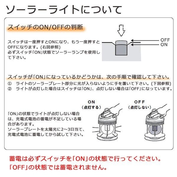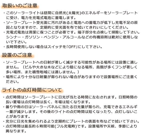 | 仕様 | ソーラーパネル 充電式電池の寿命:約1年間 ライト点灯時間:最大約6時間(フル充電時) |