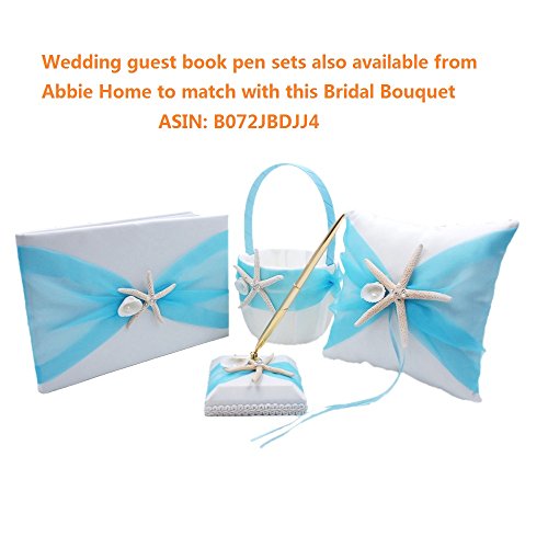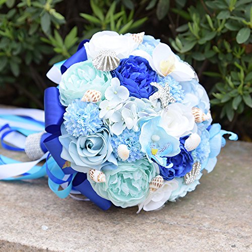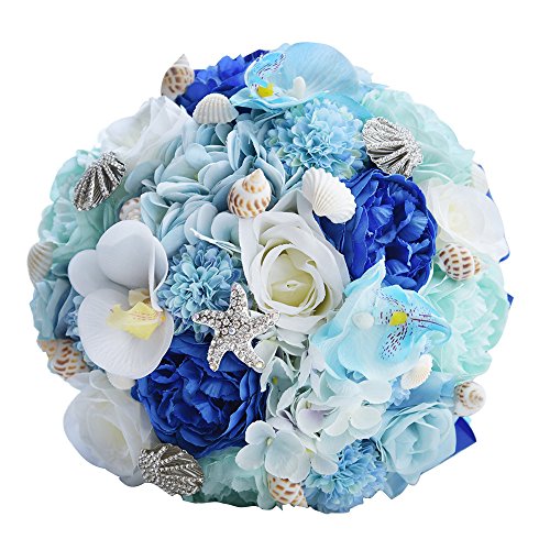 Abbie Home Bridal Bouquet Brooches for Beach Wedding Bride Blue Rose Flowers with Sea Shells Starfish Decoration (Light Blue)