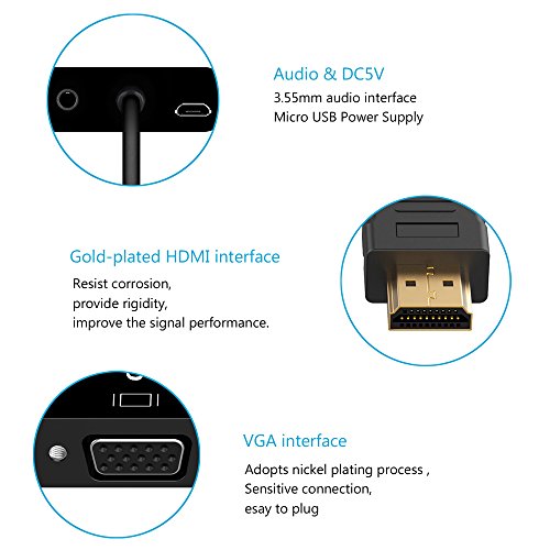The HDMI VGA converter is compatible with desktop, laptop, Ultrabook, notebook, Intel Nuc, Macbook Pro, Raspberry Pi, Chromebook, Apple TV, Roku streaming media player, cable box, or other devices with HDMI port
