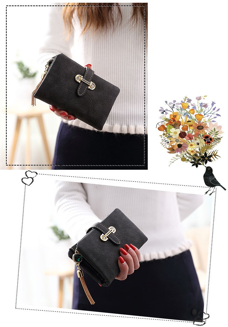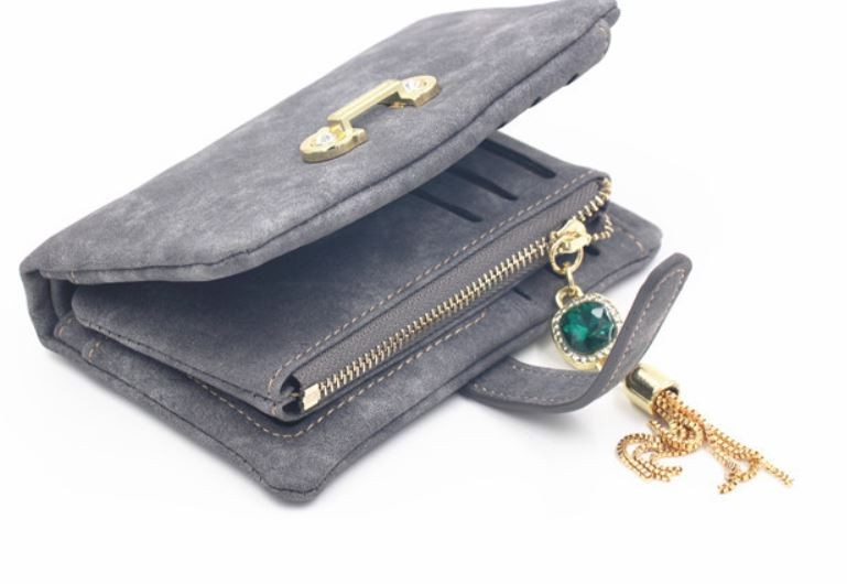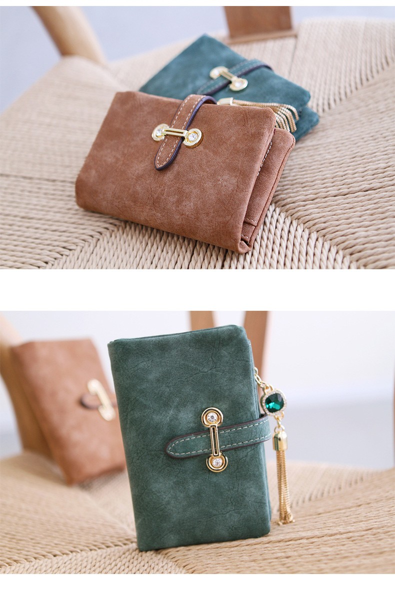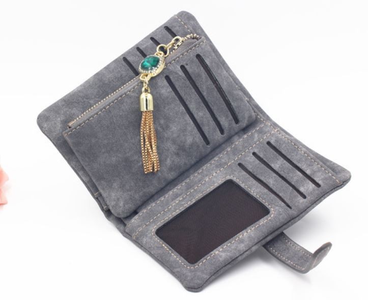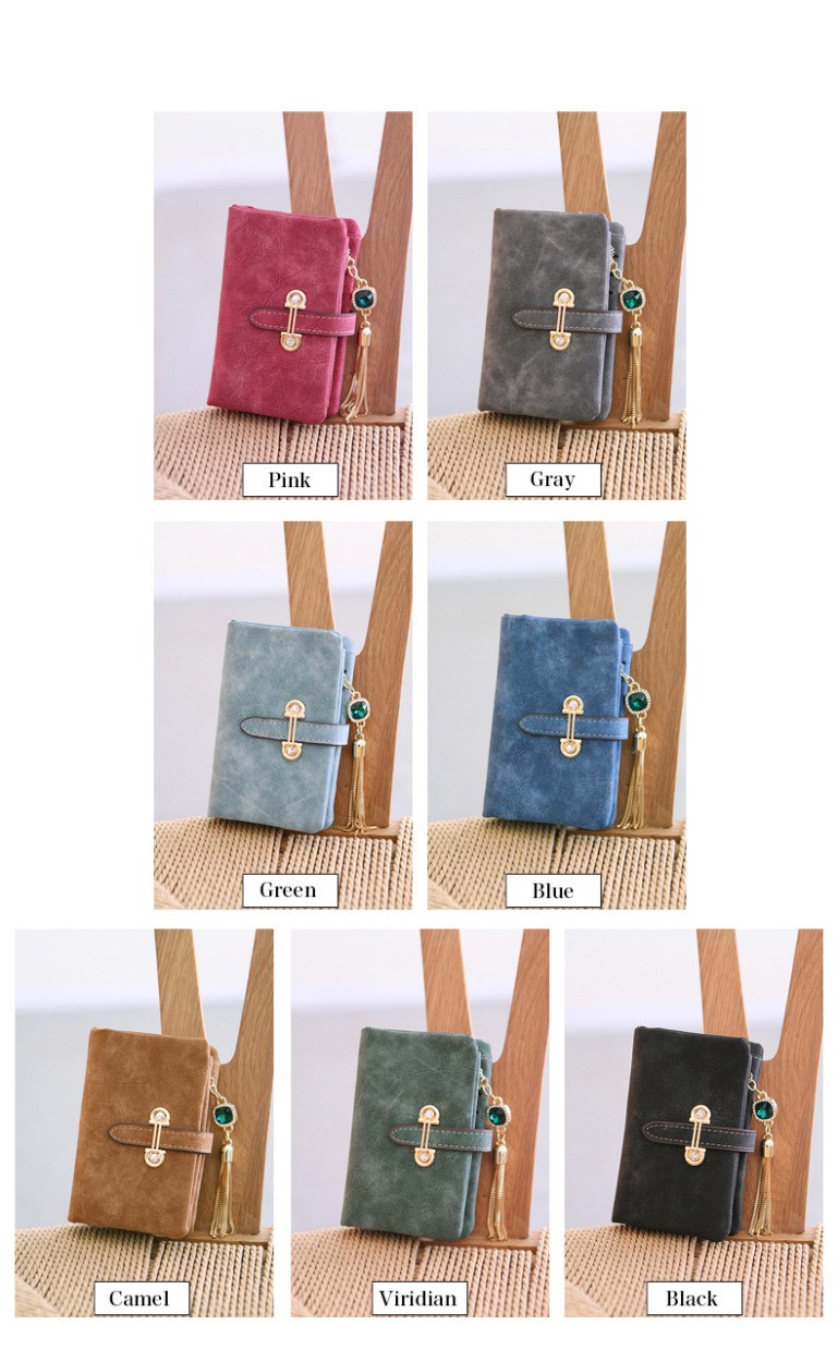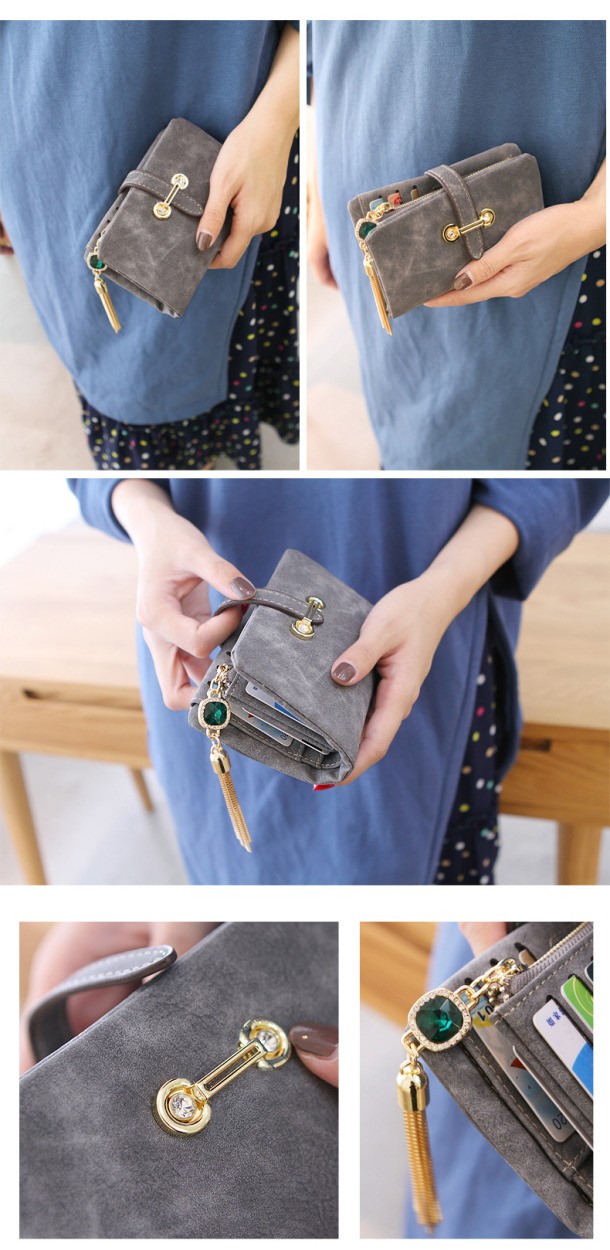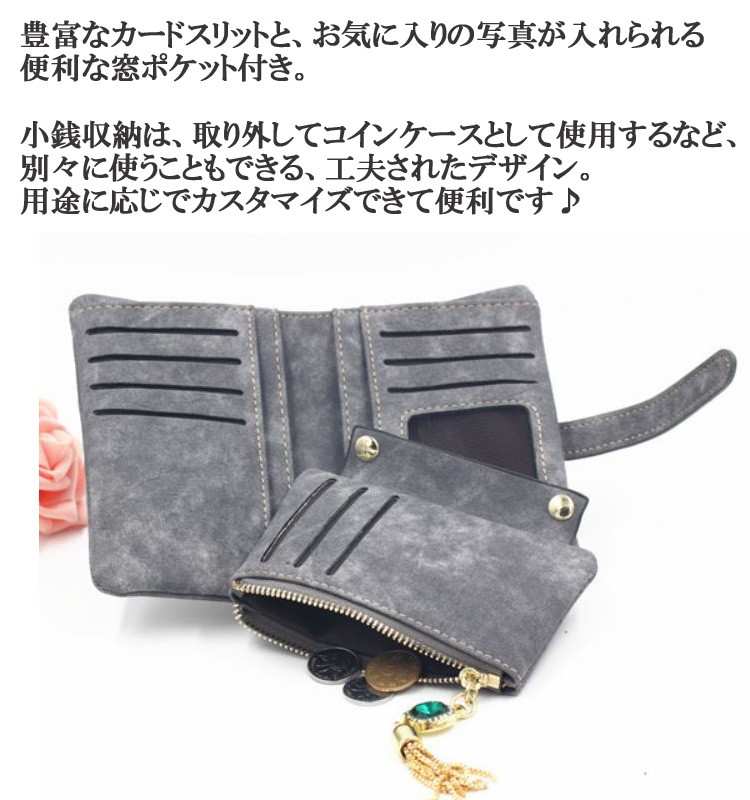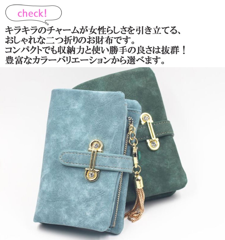 マットな質感とジュエリーのようなタッセルチャームがトレンド感溢れる二つ折り財布。カード類の収納に便利な豊富なポケット、ジップ付きの小銭入れと実用性抜群。通勤、通学の必需品のICカードもしっかりと収納できます。