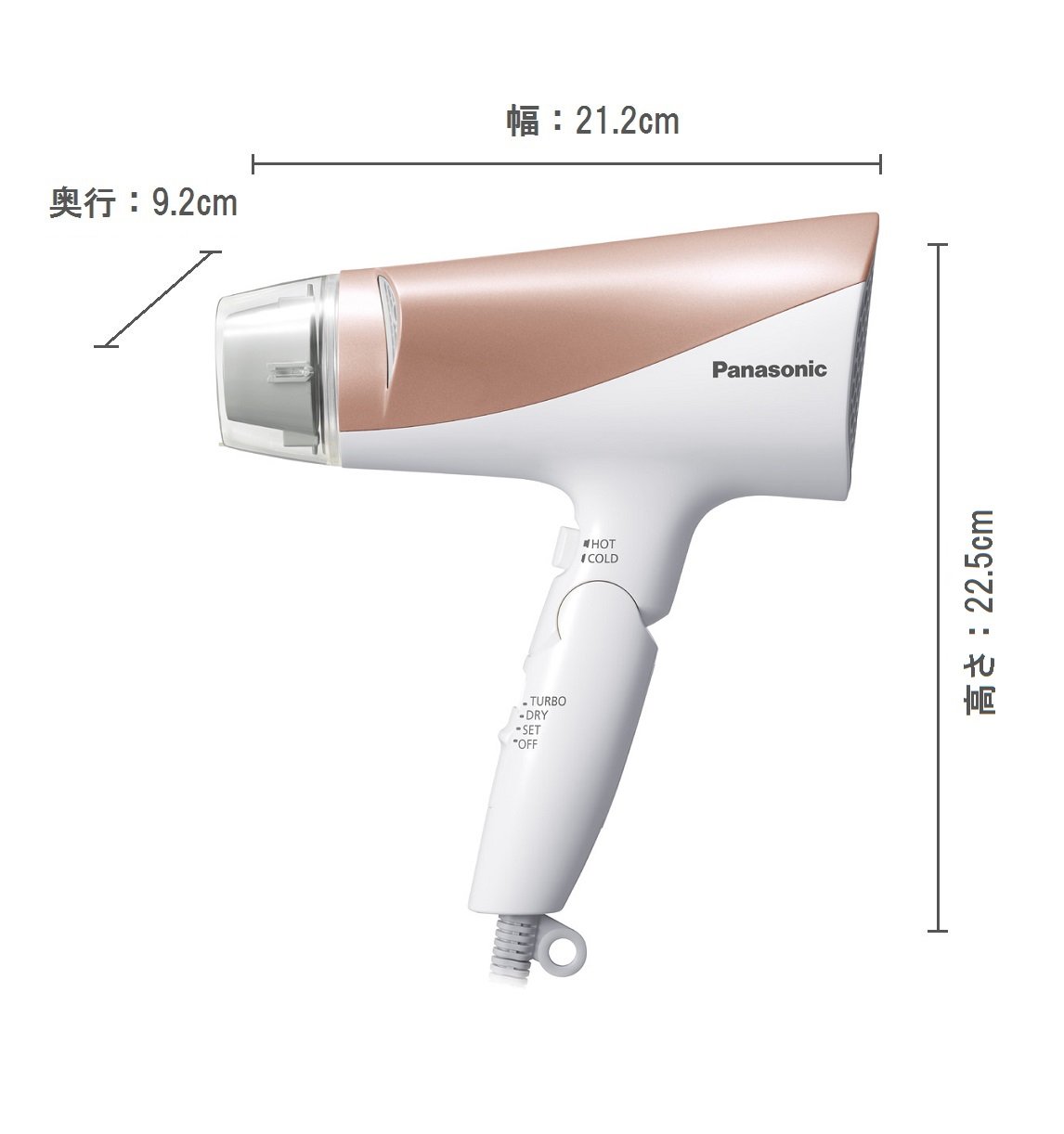 本体サイズ:高さ22.5×幅21.2×奥行9.2 cm(速乾ノズル含む) 国内専用品(100V対応) 電源:AC100V 50-60Hz 消費電力:1200 W( ターボ/ホット時) 風量:1.9㎥/分(ターボ時・ノズル装着なしの時) 本体重量(kg):0.53