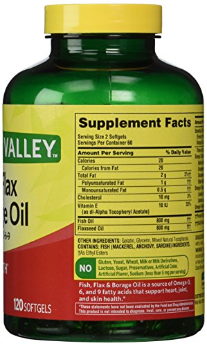 -. Binding : Health and Beauty -. Brand : Spring Valley -. EAN : 0605388628077 -. Feature : Omega 3, 6, 9. / Heart Health. / A natural source of Omega-3 EPA & DHA. / May reduce the risk of coronary heart disease. / 120 Softgels. -. IsAdultProduct : 0 -. Label : Spring Valley -. Manufacturer : Spring Valley -. MPN : 108234 -. PackageQuantity : 1 -. PartNumber : 108234 -. ProductGroup : Health and Beauty -. ProductTypeName : HEALTH_PERSONAL_CARE -. Publisher : Spring Valley -. Studio : Spring Valley -. Title : Spring Valley - Fish, Flaxseed, Borage Oil, Omega 3, 6, 9, 120 Softgels -. UPC : 605388628077