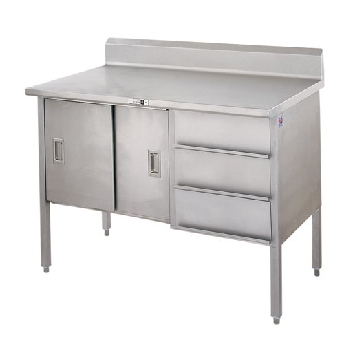 JOHN BOOS 140-31 14 GAUGE STAINLESS STEEL ENCLOSED BASE WORK TABLE WITH SLIDING DOORS AND 5" REAR RISER, 48" X 24"