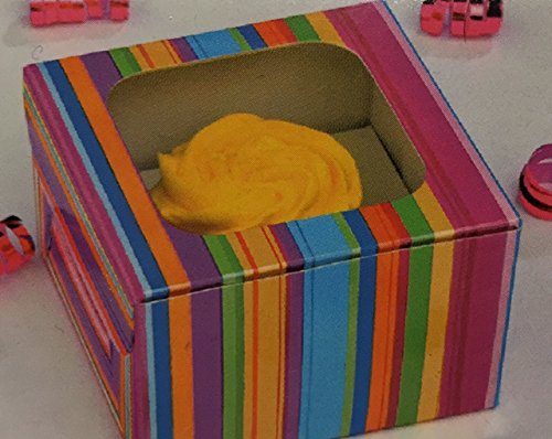 Sunny Side Up Bakery Cupcake Boxes- 3 count. Includes: 3 boxes (not assembled), each box holds 1 cupcake. Fun, striped box (colors: pink, purple, green, yellow, blue, orange). Clear piece on top to see the cupcake inside. Easy to assemble.