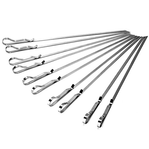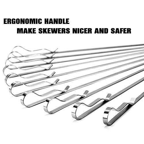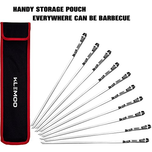 Kebabs,kabob,skewers...anyway you look at it it's food on a stick. Pain and simple. However,getting your skewers to be "perfect" isn't that easy. I've eaten plenty of dry and burned skewered things in my lifetime. Let's face it, you've spent hours marinading your meat and vegetables only to see them cooked unevenly because they rotate on those old bamboo skewers. Worry not! A much better way to save money, time and your sanity on the barbeque. Make evenly grilled, better-Looking and add bold flavor and texture before and after the skewers hit the grill are sure to get your mouth watering. Flat wide blade style provide a secure, stable hold on the food as it cooks plus infuse more heat into the center of the food, make sure the food is evenly grilled. 17" long enough that you can leave the end outside of the gril lid that make it easy to build the flavor, resulting in juicer and more flavorful. Easy to grill meat, seafood and veggies for amazing flavor, grip the handle outside of the grill lid, brush some extra marinade-onto your food while grilliing adds layer upon layer of glazey deliciousness. Save your time, made of stainless steel, durable and corrosion-resistant, unlike wooden skewers, reusable metal skewers don't require soaking time to prevent scorching. Added bonus,came with a nice storage pouch to hold and carry/store the skewers easily, not limiting them to the standard backyard grill, perfect for any camping outing or bonfire party. We love our customers and are obsessed with your satisfaction. KLEMOO is Amazon registered brand and a culinary expert of kitchen cookware and cooking accessories. We love our customers and offer "ONE YEAR" Warranty and provide friendly, easy-to-reach support. Before your next weekend get-together, Click "Add to Cart" now, become the king or queen of skewered. 0