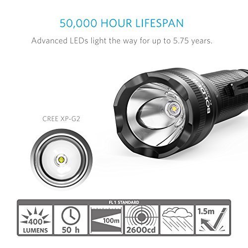 SUPER-BRIGHT: 400-lumen Cree LED (50000-hour lifespan). A compact, yet radiant flashlight to illuminate any dark spot, space, or place. Features High / Medium / Low / Strobe / SOS modes.