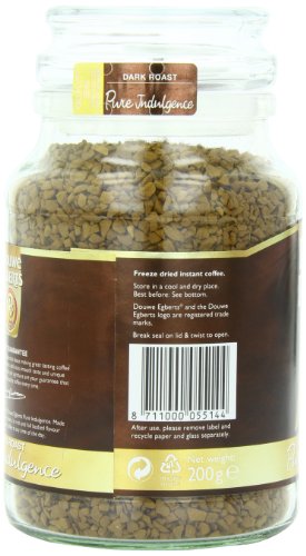 Douwe Egberts Pure Indulgence Freeze-Dried Instant coffee in glass jar Net 7oz/200g Douwe Egberts Pure Indulgence is a blend of the finest beans. These beans have been roasted using Douwe Egberts expertise to give a rich and aromatic flavor suitable for drinking at any time of the day. This blend is a darker roast than Douwe Egberts Pure Gold with a richer taste and full aroma. The Douwe Egberts coffee tradition goes back to 1753, so more than 250 years of expertise have gone into creating this luxurious instant coffee. The Douwe Egberts seal and signature is an assurance of constant quality and high standards. Dark Roast Full Strength