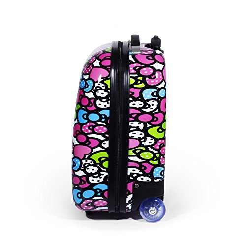 Hello Kitty pink Kitty all over print features pink signature Hello Kitty face print on a sturdy polycarbonate carry on luggageFeature