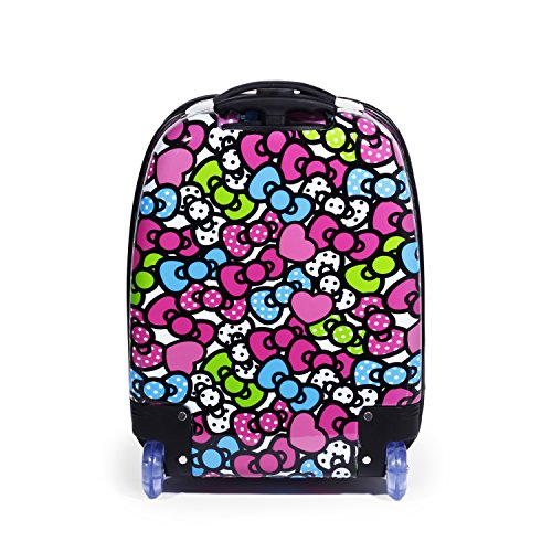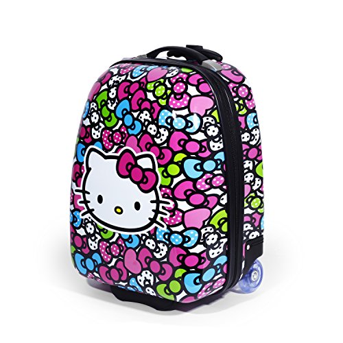 Hello Kitty pink Kitty all over print features pink signature Hello Kitty face print on a sturdy polycarbonate carry on luggage
